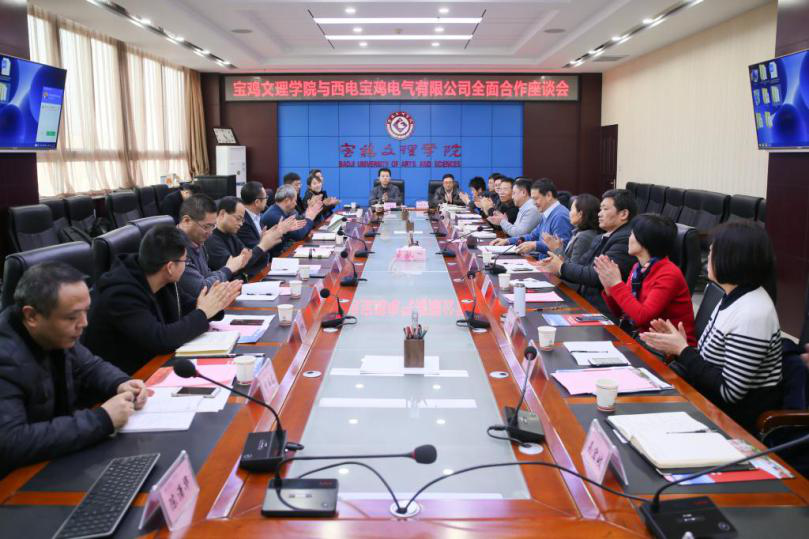 1月17日下午, 西电宝鸡电气与宝鸡文理学院全面合作座谈会在宝鸡文理学院顺利召开。宝鸡文理学院党委书记白黎、西电宝鸡电气总经理谢洪涛出席会议并讲话。