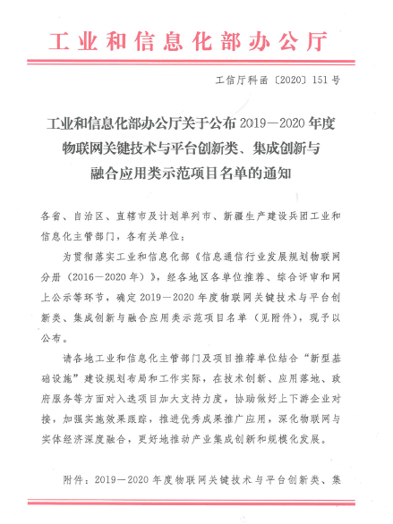 2019年9月,国家工业和信息化部开展2019年物联网项目征集工作,向国内征集具有示范效果、市场影响力、产业带动性等要素,具备模式复制和应用推广基础条件的在建或建成项目。公司积极响应,根据文件要求,对项目的技术资料、公司财务报表、纳税证明、荣誉证明等资料进行了详细收集梳理,最终公司所递交、填报的资料成功通过了专家评审,成功入选示范项目名录。