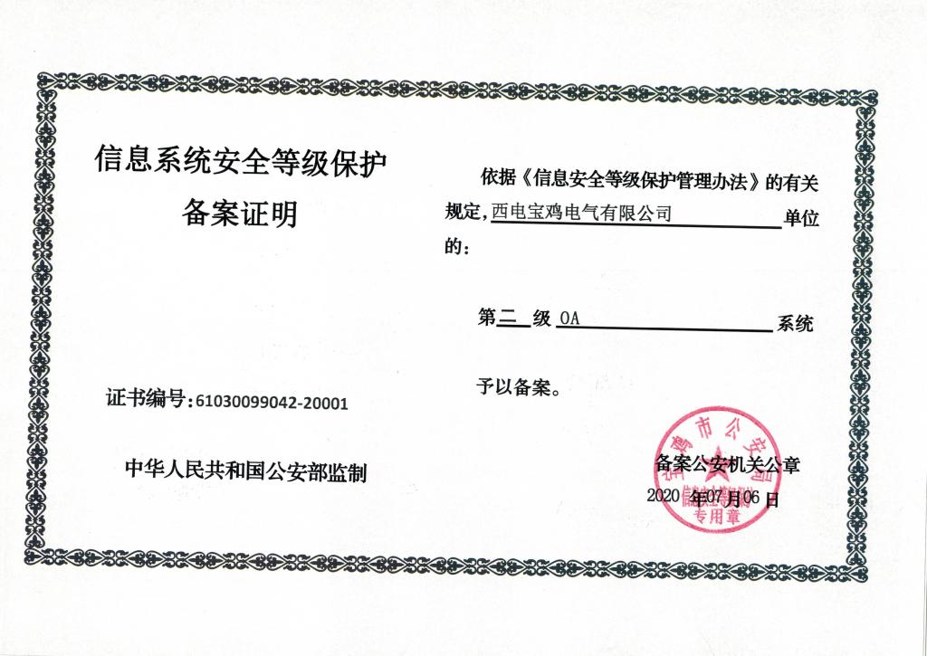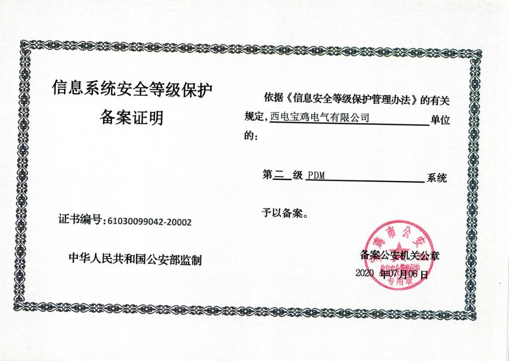 按照国家网络安全相关规定和国家信息安全等级保护制度的要求,2020年3月开始,西电宝鸡电气启动了网络安全等级保护项目实施准备工作。经过系统梳理自查、完善整改,6月9日-6月12日,由等级保护测评机构对公司OA和PDM信息系统,分别从物理机房环境、网络设备、服务器、应用系统、信息安全管理制度等方面,通过对服务器漏洞扫描、系统渗透测试等测评,最终得分符合二级等级保护备案标准要求,于2020年7月6日顺利取得公安部门颁发的等级保护备案证书。