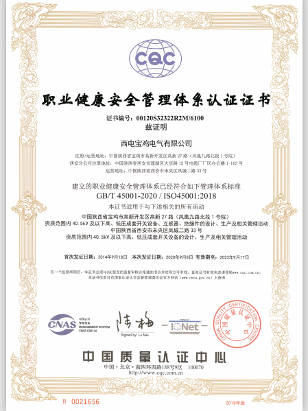 近日,西电宝鸡电气顺利取得了由中国质量认证中心颁发的质量、环境、职业健康安全管理体系新的认证证书,标志着该司质量、环境管理体系的复评换证,职业健康安全管理体系的换版工作圆满完成。