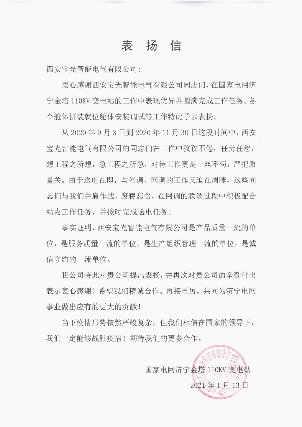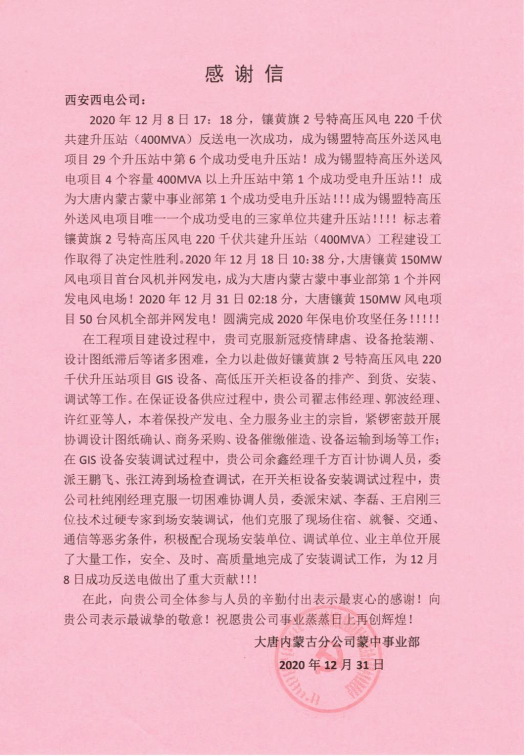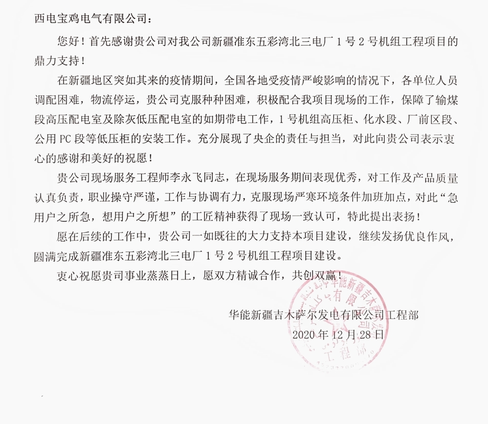 近日,西电宝鸡电气、宝光智能先后收到华能新疆吉木萨尔发电有限公司、山东电力建设第三工程有限公司、山东济宁圣地电业集团有限公司济宁金塔110KV输变电工程施工项目部、大唐内蒙古分公司蒙中事业部四封感谢信。 四封感谢信都对西电宝鸡电气、宝光智能“急用户所急、想用户所想”的工匠精神表示高度认可和表扬;对公司运维服务工作人员熟练的工作技能,认真的工作态度、不怕吃苦的工作精神表示衷心的感谢;全心全意为工程建成投产提供了重要保障,充分彰显了央企担当,并希望双方能够精诚合作,共同创造更多的精品工程。