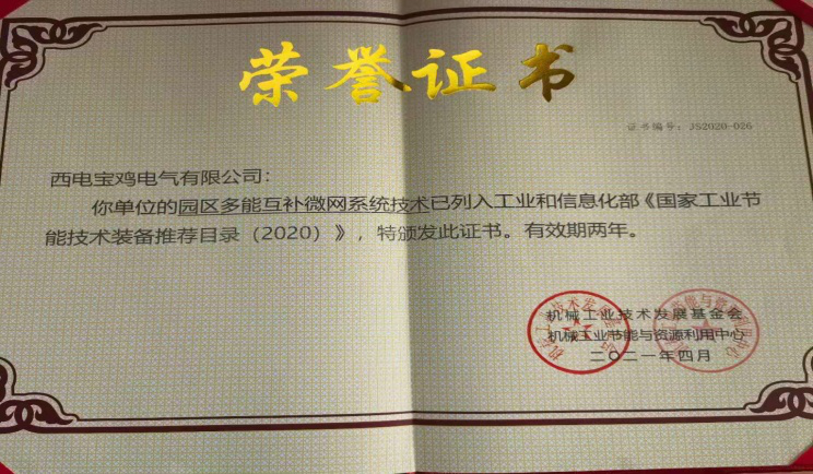 近日,西电宝鸡电气多能互补微网系统技术成功入选工业和信息化部公布的《国家工业节能技术装备推荐目录(2020)》,这是该项目被工业和信息化部列入2019-2020年物联网关键技术与平台创新类、集成创新与融合应用类示范项目名单后,又一次获得的国家级荣誉。