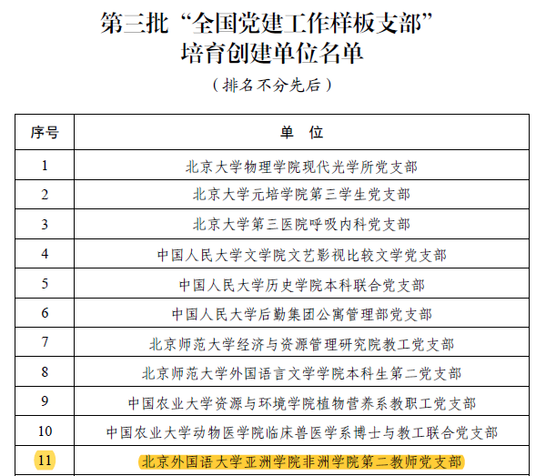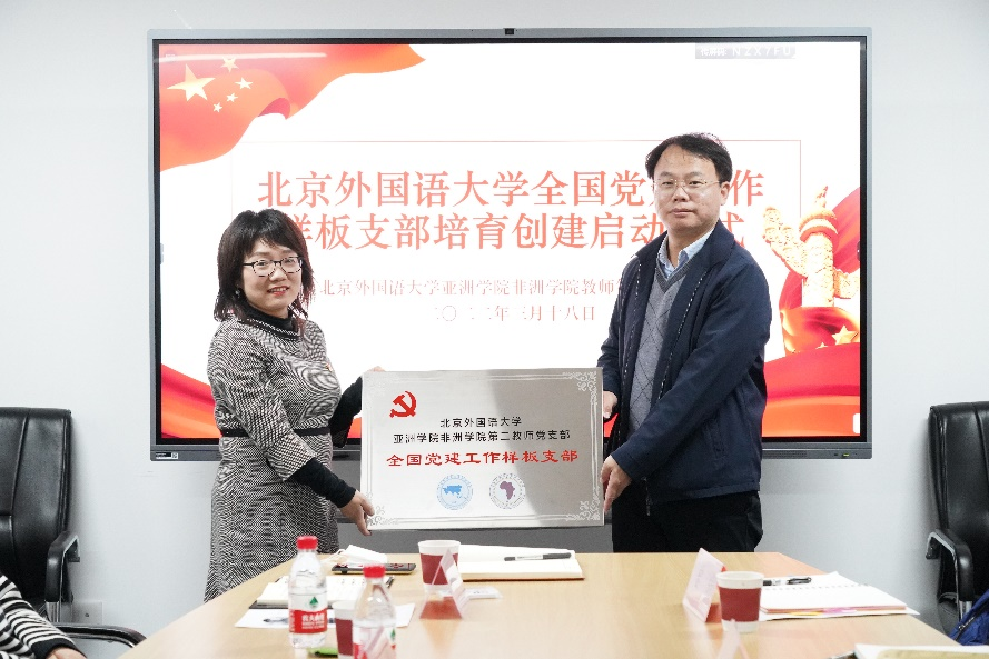 党委宣传部副部长、新闻中心负责人王薇薇宣读了《教育部办公厅关于公布第三批全国党建工作示范高校、标杆院系、样板支部培育创建单位名单的通知》。党委组织部常务副部长冯刚为pa电子官方网站非洲学院教师第二党支部授牌,勉励支部党员在党建和学科建设深度融合的道路上继续前进。