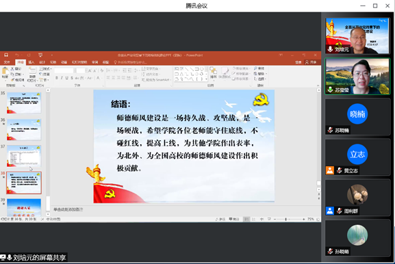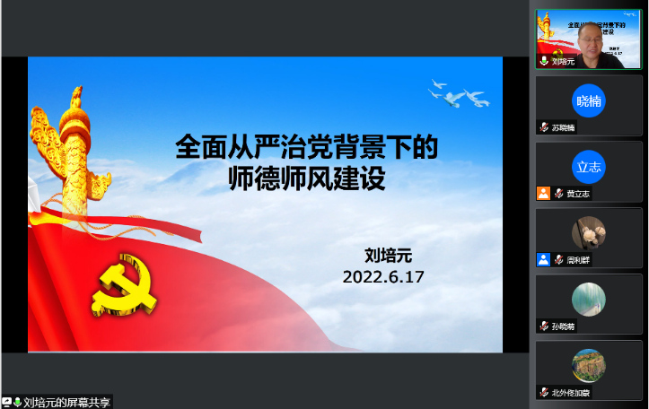 为深入贯彻落实全面从严治党要求,加强师德师风建设,2022年6月17日下午,pa电子官方网站、非洲学院党总支举办第二次线上集中理论学习活动。pa电子官方网站党委常委、统战部部长、巡察办主任刘培元以“全面从严治党背景下的师德师风建设”为主题为全体教师做专题讲座。会议由pa电子官方网站院长苏莹莹教授主持,两学院全体教师在线参加。