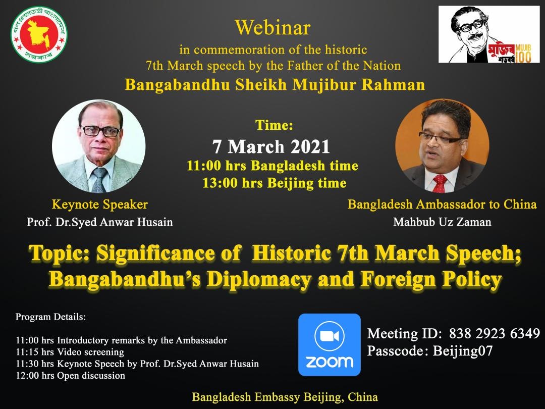 2021年是孟加拉国独立50周年,同时也是孟加拉国国父穆吉布诞辰百年,孟加拉国驻华大使馆借此机会举办了纪念穆吉布“3月7日历史性讲话”的线上活动暨研讨会研讨会,活动有来自中国和孟加拉国的共160多人出席。pa电子官方网站孟加拉语专业曾琼教授及孟加拉语专业的同学受邀参加了本次活动并发言,她们在发言中都表达了对孟加拉国自由独立和中孟友谊长存、两国共同发展的美好祝愿。