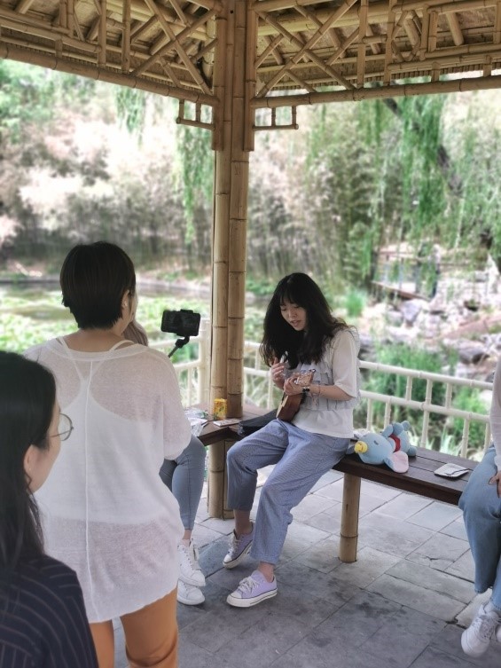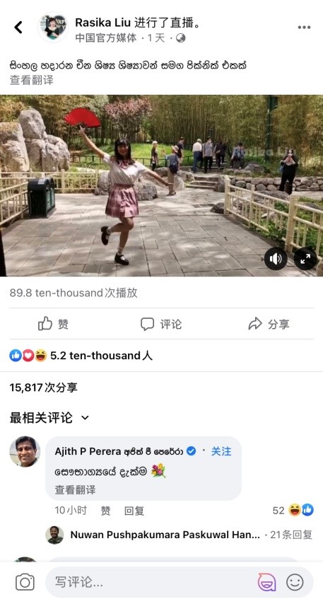 此次直播节目由中央广播电视总台亚非中心僧伽罗语部主播、北外僧伽罗语专业2004届校友刘晖主持。直播于紫竹院公园的一处凉亭进行,斯里兰卡观众通过“脸书”平台与2018级僧伽罗语专业的9位同学一起参与了一次特别的“云”野餐活动,氛围轻松愉快。直播环节中,同学们在直播镜头前用僧伽罗语进行了自我介绍并与斯里兰卡观众热情互动。随后,同学们通过中国传统民间游戏“击鼓传花”展示了舞蹈、唱歌、尤克里里弹唱等才艺、并实时回答了在线网友的提问。僧伽罗语班同学们流利的口语及精彩的才艺展示获得了海外网友的纷纷点赞。