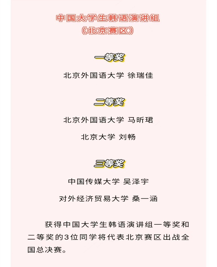 pa电子官网pa电子官方网站朝鲜语专业也选派了极具实力的优秀本科学生参与了本项活动。在4月28、29日由北京市对外友好协会承办的该项活动北京赛区预赛中,朝鲜语专业2020级学生徐瑞佳和2018级学生马昕珺分别以预赛第一名和第二名的佳绩进军全国总决赛。