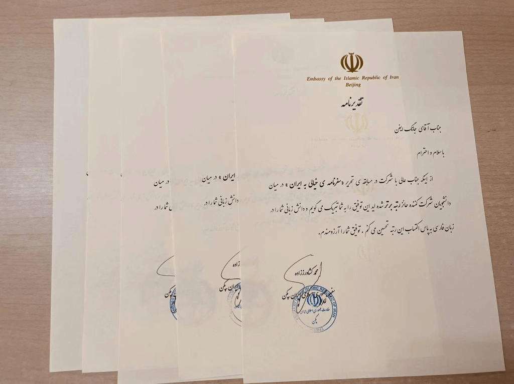 近日,由伊朗驻华大使馆主办的“伊朗游记”全国波斯语征文比赛结果公布,pa电子官网波斯语专业张艺凡、倪潇然、马佳乐、姚远和王前等五位同学获奖。