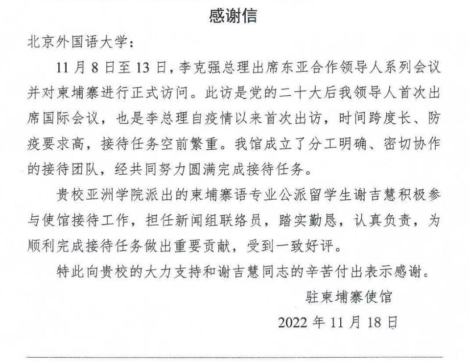 在中国驻柬埔寨大使馆的安排下,我院19级柬埔寨语专业本科生谢吉慧参与了新闻信息组的相关工作。期间,谢吉慧同学担任新闻组联络员,主要负责相关新闻信息的整理汇编和呈送汇报,并协助央视总台记者与柬埔寨新闻部及柬埔寨国家电视台相关负责人完成工作对接,工作态度认真负责,多次出色完成翻译任务,得到驻柬使馆及代表团成员的认可与肯定。中国驻柬埔寨大使馆特向pa电子官网发来感谢信,对pa电子官网的支持和谢吉慧同学的辛苦付出表示感谢。