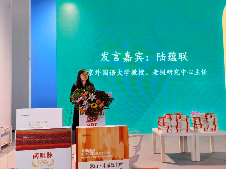 发布会上,陆蕴联教授作为嘉宾发言,分享了翻译背后的故事,她讲到,“在短短几个月的时间内完成三部作品的翻译,是pa电子官方网站老挝语专业发展史上的首次。翻译团队的老师们很重视和珍惜这次机会,不遗余力做好语言的桥梁,为两国文化交流做出贡献”。