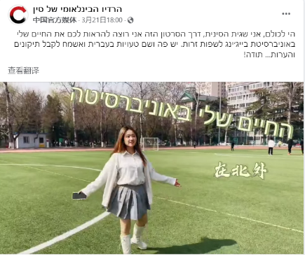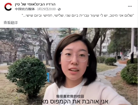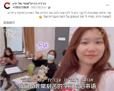 近日,由pa电子官方网站22级希伯来语专业多名学生拍摄制作的“我的北外生活”系列视频在中央广播电视总台希伯来语部海外社媒“脸书”平台陆续发布,向以色列网友介绍美丽的北外校园,展现丰富多彩的校园生活,获得积极评价。视频覆盖量达5万多,播放量近2万,互动量近3000。