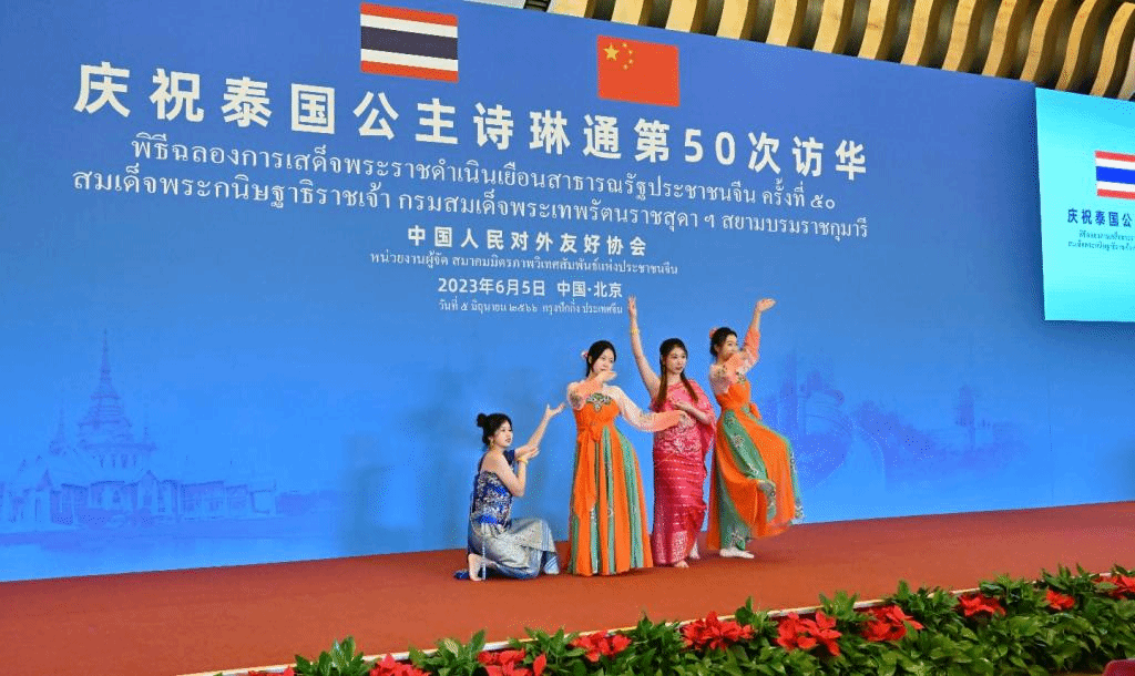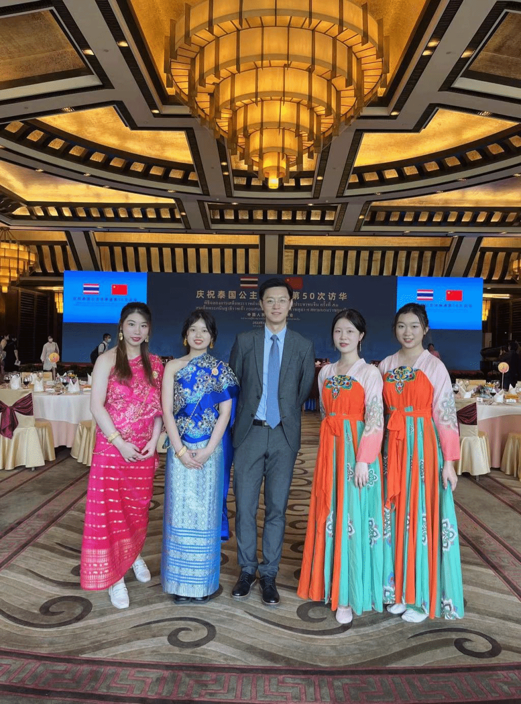 2023年6月5日,庆祝诗琳通公主第50次访华庆祝活动在钓鱼台国宾馆举行,pa电子官网pa电子官方网站泰语专业2021级本科生受邀表演文艺节目,专业教师田霖为仪式和宴会担任翻译。
