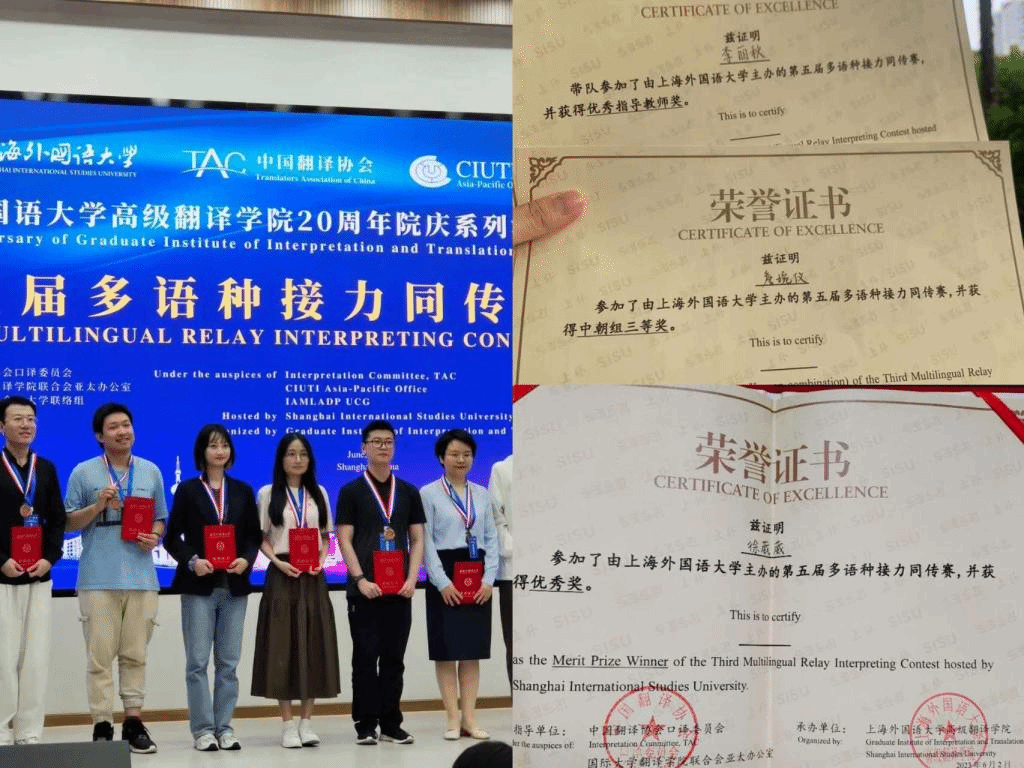 在6月2日结束的多语种接力同传赛决赛中,pa电子官网pa电子官方网站朝鲜语专业两位2022级朝鲜语口译方向硕士同学在决赛阶段发挥出色,其中詹婉仪获得决赛三等奖,徐葳葳获得优秀奖。此外,作为pa电子官网朝鲜语专业口译方向研究生培养的主要负责人李丽秋教授带队参加本次决赛,并获得了优秀指导教师奖。