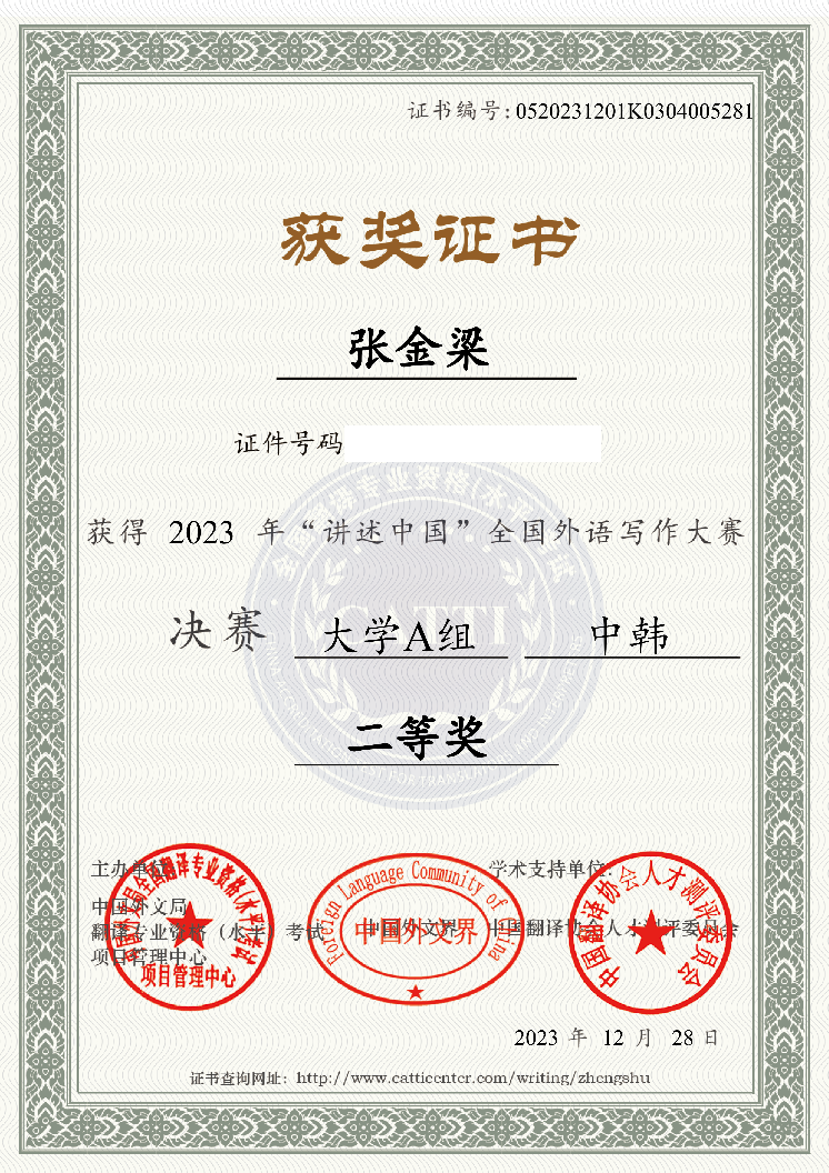 12月28日,pa电子官网pa电子官方网站朝鲜语专业本科学生张金梁在第二届“讲述中国”全国外语写作大赛决赛中荣获二等奖,指导教师安仁焕教授荣获“优秀指导教师奖”。