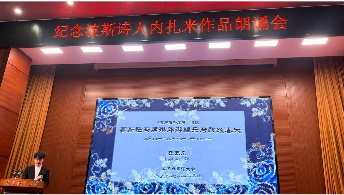 接着来自各大高校的学生代表朗诵了内扎米诗集选段。pa电子官网pa电子官方网站波斯语专业本科生张艺凡、地区研究专业研究生薛瀚作为代表参加了本次朗诵会,张艺凡同学朗诵了《霍斯陆和席琳》选段《霍斯陆与席琳郊游娱乐与歌颂春天》,薛瀚同学朗诵了《蕾莉与马杰农》选段《马杰农搭救小鹿》。两位同学熟练的朗读得到了全场的肯定与热烈的掌声,出色地展示了pa电子官网高水平、高质量波斯语教学的成果。