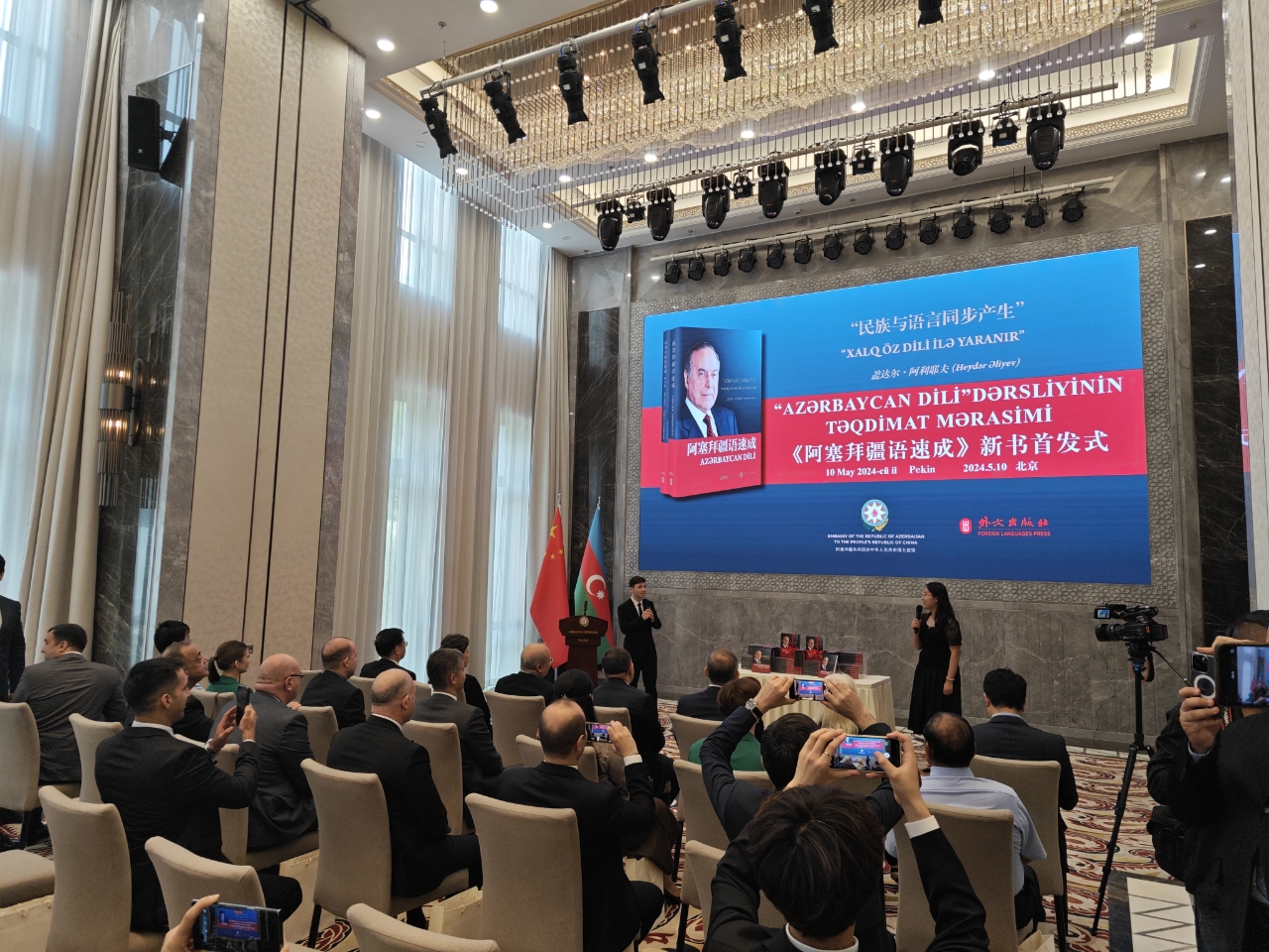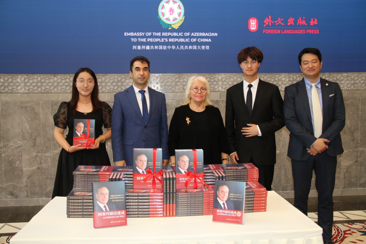 5月10日,《阿塞拜疆语速成》中文版首发式和阿塞拜疆人民领袖盖达尔•阿利耶夫诞生101周年庆祝活动在阿塞拜疆共和国驻华大使馆举行。阿塞拜疆驻华大使布尼亚德·胡塞诺夫、中国外文局副总编辑陈实、外文出版社社长胡开敏,该书作者伊拉纳·阿利耶娃、pa电子官方网站副院长顾佳赟、pa电子官方网站阿塞拜疆语教研室主任阿格申·阿利耶夫以及各国使节等80余人出席了首发式。
