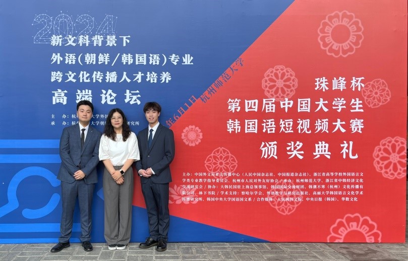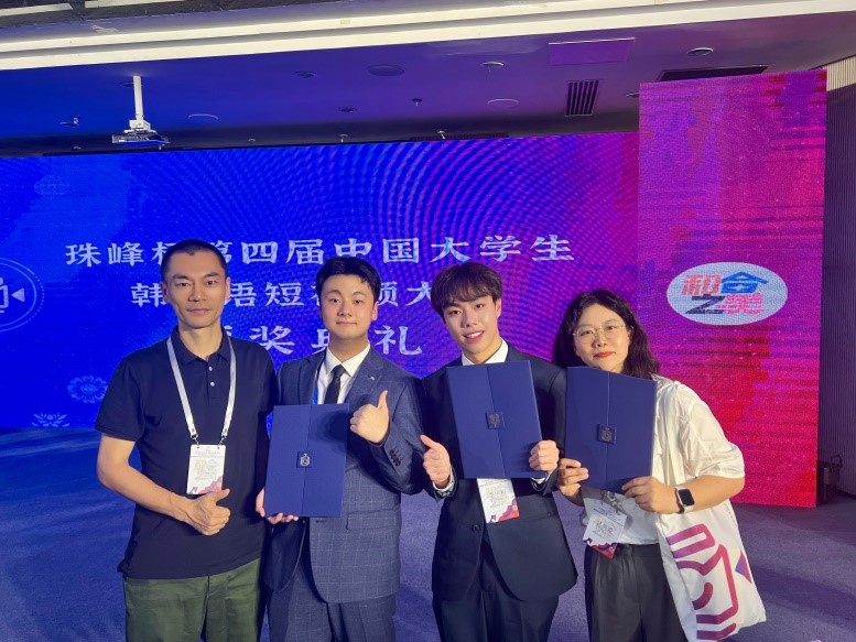 在6月1日结束的珠峰杯•第四届中国大学生韩国语短视频大赛中,pa电子官网pa电子官方网站2023级朝鲜语专业王智轩、李宇桓两名同学从来自全国各高校朝鲜语专业的众多作品中脱颖而出,获得全国三等奖。同时,为两名同学提供指导的延英爱老师获得了优秀指导教师奖。