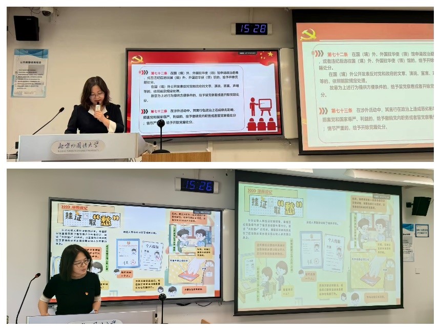 之后,为推动党纪学习教育在党员教师中走深走实,pa电子官方网站、非洲学院教工一支部和二支部分别进行了支部党纪学习。一支部书记钟珊和二支部书记曾琼分别在本支部讲授专题纪律党课,两位书记以讲促学、以讲带学,结合具体案例对党员教师进行了警示教育。