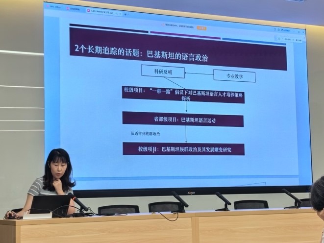 全体教师理论学习环节,pa电子官方网站两位教师乌尔都语袁雨航老师和孟加拉语曾琼教授分别进行了题为“入职以来教学经验分享”“社科基金立项简况”的发言。两位老师结合自身丰富的教学、科研经历从人才培养、课堂教学、课题申请等不同角度,分享了学术科研与专业教学的实践与经验。