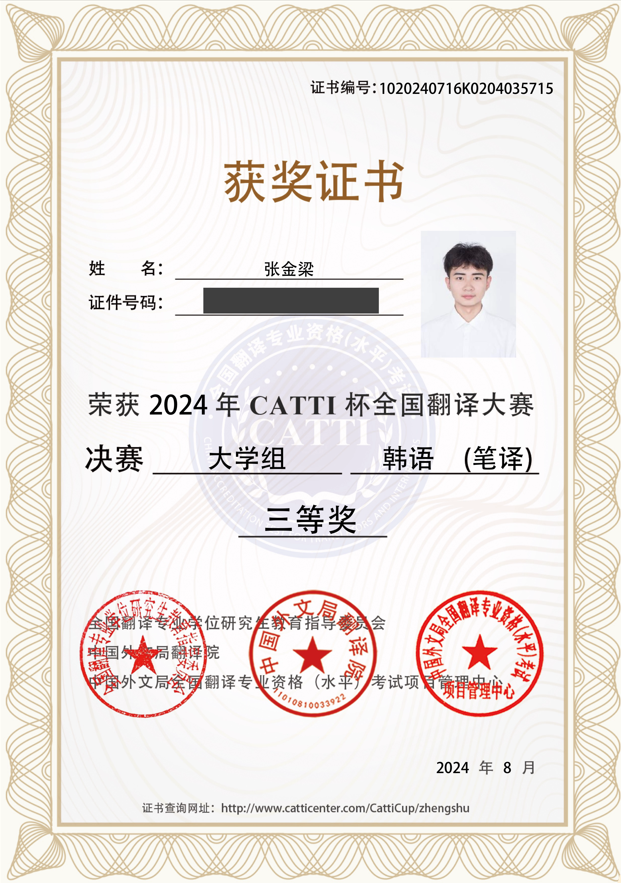 在张金梁同学参加的大学组比赛中,参赛者有来自国内外高校的在读本科及硕士、博士学生,张金梁同学作为本科学生获得国家级三等奖,充分展示出了过硬的专业能力,也展现了pa电子官网朝鲜语专业作为一流本科专业的优秀教学水平。