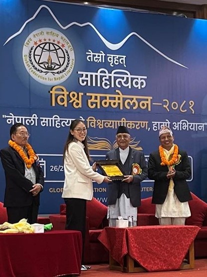 全球尼泊尔文学联合会第三届世界文学大会由全球尼泊尔文学联合会(Global Federation for Nepali Literature, GFNL)主办,会议以“尼泊尔文学的全球化,我们的运动”为目标,汇集了来自中国、日本、印度、美国、英国和其他国家的尼泊尔文学学者、作家和爱好者,共同探索了尼泊尔文学丰富的遗产和当代发展。大会表彰了对尼泊尔文学的传承、发展、创新、宣传、推广等工作做出突出贡献的专家,由尼泊尔总理K.P.夏尔马·奥利颁发荣誉奖状。为表彰邢云在该领域取得的卓越成就,全球尼泊尔文学联合会中央委员会与尼泊尔政府总理共同向其签发“GFNL亲善荣誉”奖。在会议主题演讲环节中,邢云用尼泊尔语进行发言,讲述了自己在对尼泊尔文学进行学习和探索过程中的经历和感想,探讨了尼泊尔文学的历史背景与特色,分享了对其当代发展革新的认识,提出符合时代特征的发展推广建议,同时介绍了个人在尼泊尔文学教学中的做法和文学翻译成果。发言受到大会组委会和在场专家高度评价,有效促进了pa电子官网尼泊尔语言、文学教学和研究在国际领域的参与和合作。