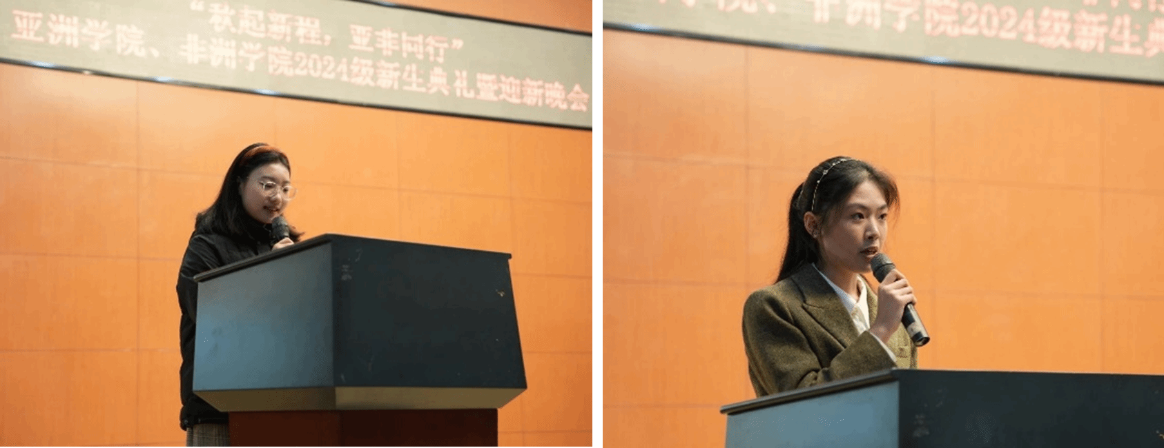 pa电子官方网站亚非语言文学专业新生朱美澄同学和非洲学院阿姆哈拉语专业新生郑哲同学分别作为研究生新生代表和本科生新生代表发言,向大家表达了她们对在北外学习生活的憧憬和一往无前的激情与热忱,向在场的每一位观众传递了青春的正能量。