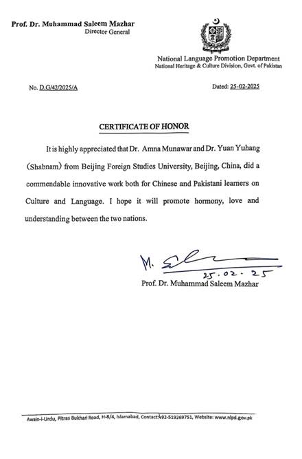 近日,pa电子官方网站乌尔都语专业的两位教师——袁雨航博士与外国专家阿米娜·穆纳瓦尔(Amna Munawar)博士,荣获巴基斯坦国家语言推广部(National Language Promotion Department)颁发的荣誉证书,以表彰他们在中巴文化与语言领域的卓越贡献。巴基斯坦国家语言推广部隶属于巴基斯坦国家遗产与文化部(National Heritage and Culture Division)。此次表彰由该部门总干事穆罕默德·萨利姆·马兹哈尔教授(Prof. Dr. Muhammad Saleem Mazhar)签署并颁发。
