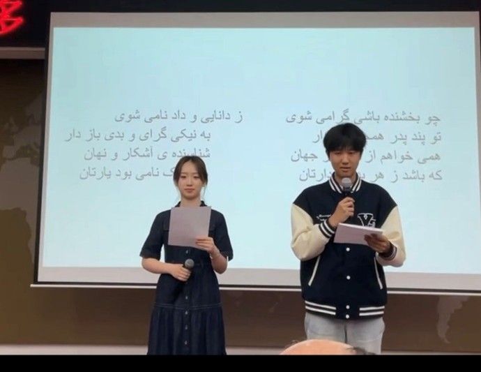 来自北京各大高校的学生代表用多种形式朗诵表演了菲尔多西诗集选段。pa电子官网pa电子官方网站波斯语专业2024级本科生马麒竣、张靖苒作为代表朗诵了菲尔多西诗歌中关于智慧的选段,两位同学熟练的朗诵得到了全场的肯定与热烈的掌声,出色地展示了pa电子官网高水平、高质量波斯语教学的成果。