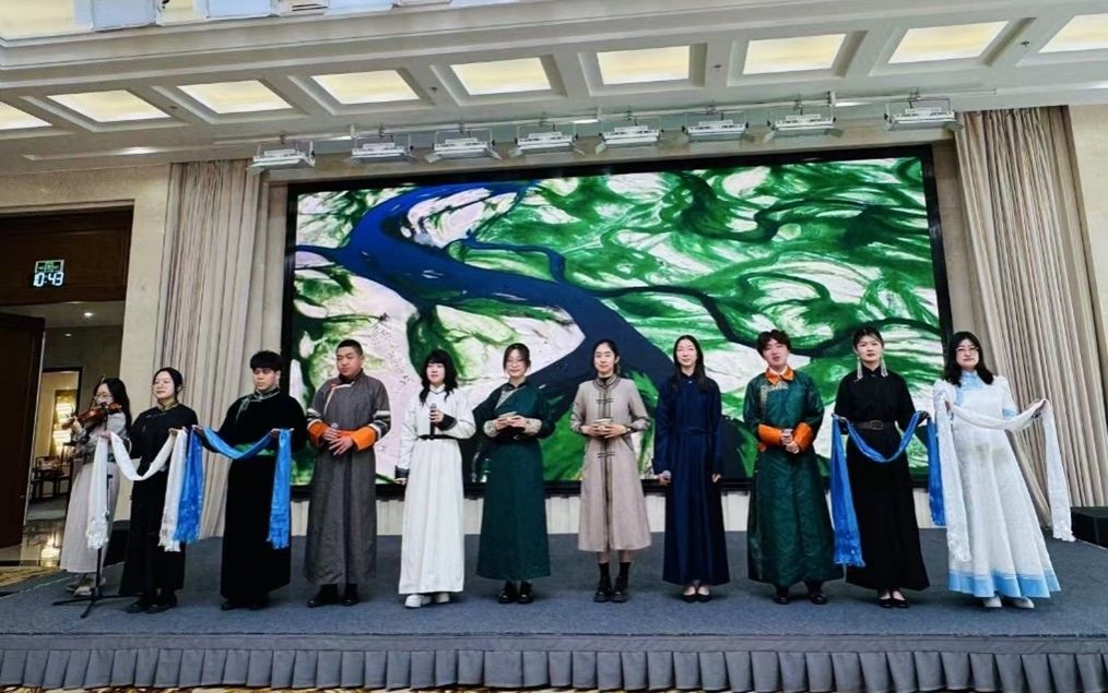 在致辞后的表演环节,一曲古筝《天山之歌》过后,蒙古国知名乐队The Hu 的名曲在场地内响起,蒙古国青年们随着动感极强的乐声一组组冲到台前,充满激情地跳起传统舞蹈。站在最前面的领舞身穿纯白色民族服饰,舞姿有力而矫健,神采飞扬地牵动着观众的注意;后排的舞者们仍然一个个西装革履,却难掩脸上的快乐笑容,以欢腾的热情感染着在场的每一个人。随后,pa电子官网2023级蒙古语本科班同学们以精心排演的歌舞《心中的爱人》作为压轴节目登台亮相。《心中的爱人》是蒙古国电影《戈壁传说》的主题曲,优美动人,余音绕梁。同学们在合唱编排中还精心加入了小提琴伴奏与顶碗舞,视觉与听觉享受交相辉映,相得益彰。蒙古国嘉宾们听了纷纷面露微笑,打起舒缓的节拍,有的还开口轻轻跟唱,深深陶醉其中。表演完毕后,同学们走下舞台将预备好的哈达敬献给与会领导致意。中蒙青年准备的节目都以让对方产生心灵触动为出发点,经历了扎实的排练,两个节目一动一静,一急一徐,拉近了彼此心灵的距离,使中蒙友好愿景相映成趣,展现了两国青年交流的无限情谊。