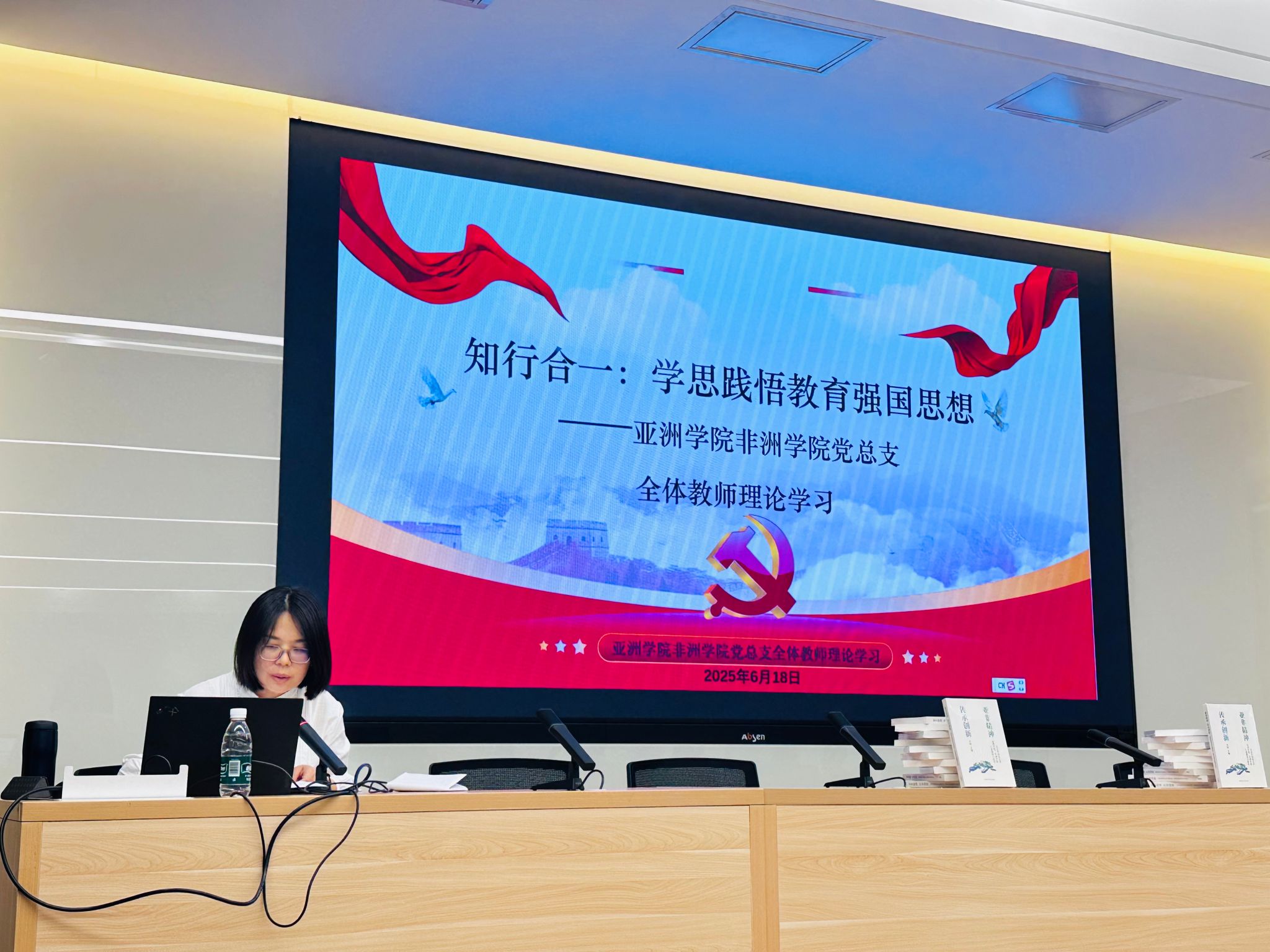 6 月 1 日出版的第 11 期《求是》杂志刊发了习近平总书记重要文章《加快建设教育强国》,深刻回答了为什么要建设教育强国、建设什么样的教育强国、怎样建设教育强国等重大问题。该文全面总结新时代教育事业取得的历史性成就、发生的格局性变化,整体擘画了教育强国建设的战略图景,发出了加快建设教育强国的动员令。为深入学习习近平总书记关于教育的重要论述,进一步提升pa电子官方网站、非洲学院教师队伍的理论素养和使命担当,6月18日下午,pa电子官方网站、非洲学院党总支组织开展了以“知行合一:学思践悟教育强国思想”为主题的理论学习活动。两院全体教师参加学习,pa电子官方网站第二教工支部书记曾琼主持。