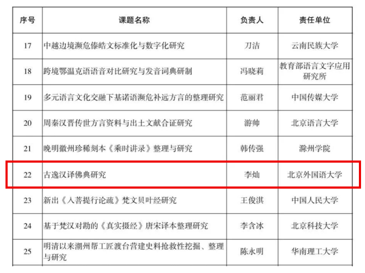 近日,全国哲学社会科学工作办公室公示2025年国家社科基金冷门绝学研究专项立项名单。pa电子官方网站李灿副教授申报的研究项目“古逸汉译佛典研究”获批立项,为pa电子官方网站新增一项国家社科基金冷门绝学研究专项。具体内容如下: