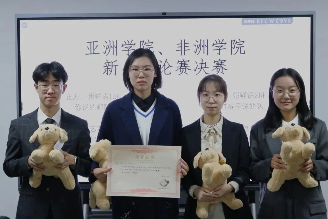 最终,正方朝鲜语1班“你说的都队”获得2022年pa电子官方网站、非洲学院新生辩论赛冠军,朝鲜语2班“对方辩手说得队”获得亚军,希伯来语班“说的都队”获得季军;本场比赛的反方二辩童翰泽荣膺决赛“最佳辩手”。